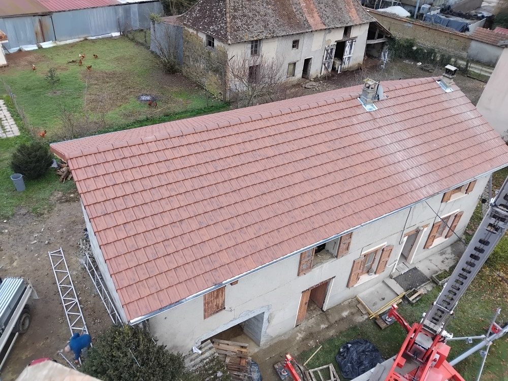 Rénovation d'une toiture d'une vieille maison d'habitation à Rochetoirin. La toiture initiale était en tuiles creuses, les murs en pisé, et nous avons rénové toute la toiture pour construire une nouvelle charpente traditionnelle dans sa globalité avec taille en atelier. Pose de couverture en tuiles terres cuites et pose de gouttières et abergement de cheminée en zinc.